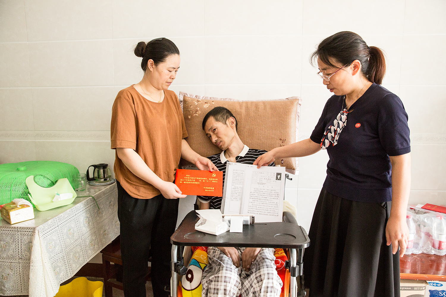 七一期间,射阳县审计局党总支开展“四送四共”活动,为生活困难党员送去党徽、党章、入党志愿书(复印件)、慰问金。图为6月29日下午,该局党员走访慰问兴桥镇新庄村困难党员。(薛国春)