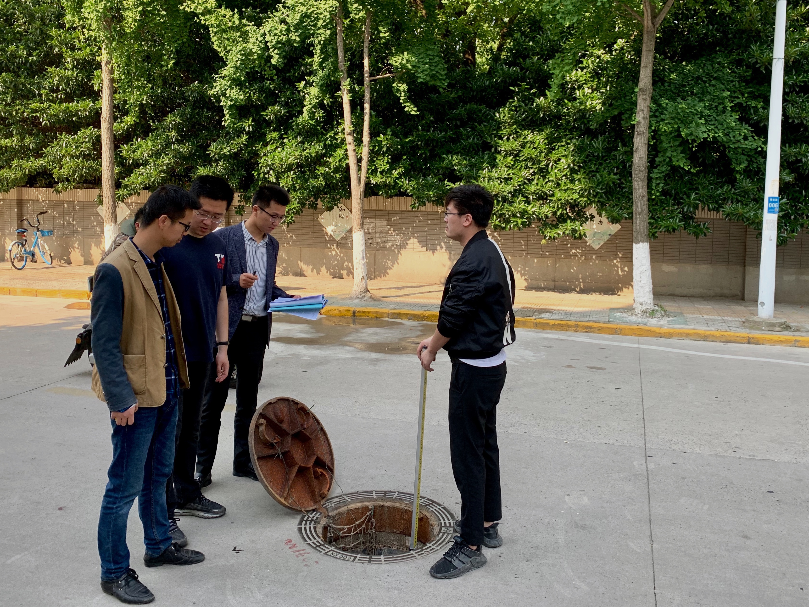 近日,盐城市审计局在市区雨污分流改造工程项目竣工决算审计中,组织审计人员对该工程老小区改造进行审计调查,详细了解居民满意度,重点关注改造资金投入和使用情况,雨污水分流改造效果等内容,助力改善民居环境,促进城市健康发展。图为审计人员现场检测检查井深度。(成烨、王志华)