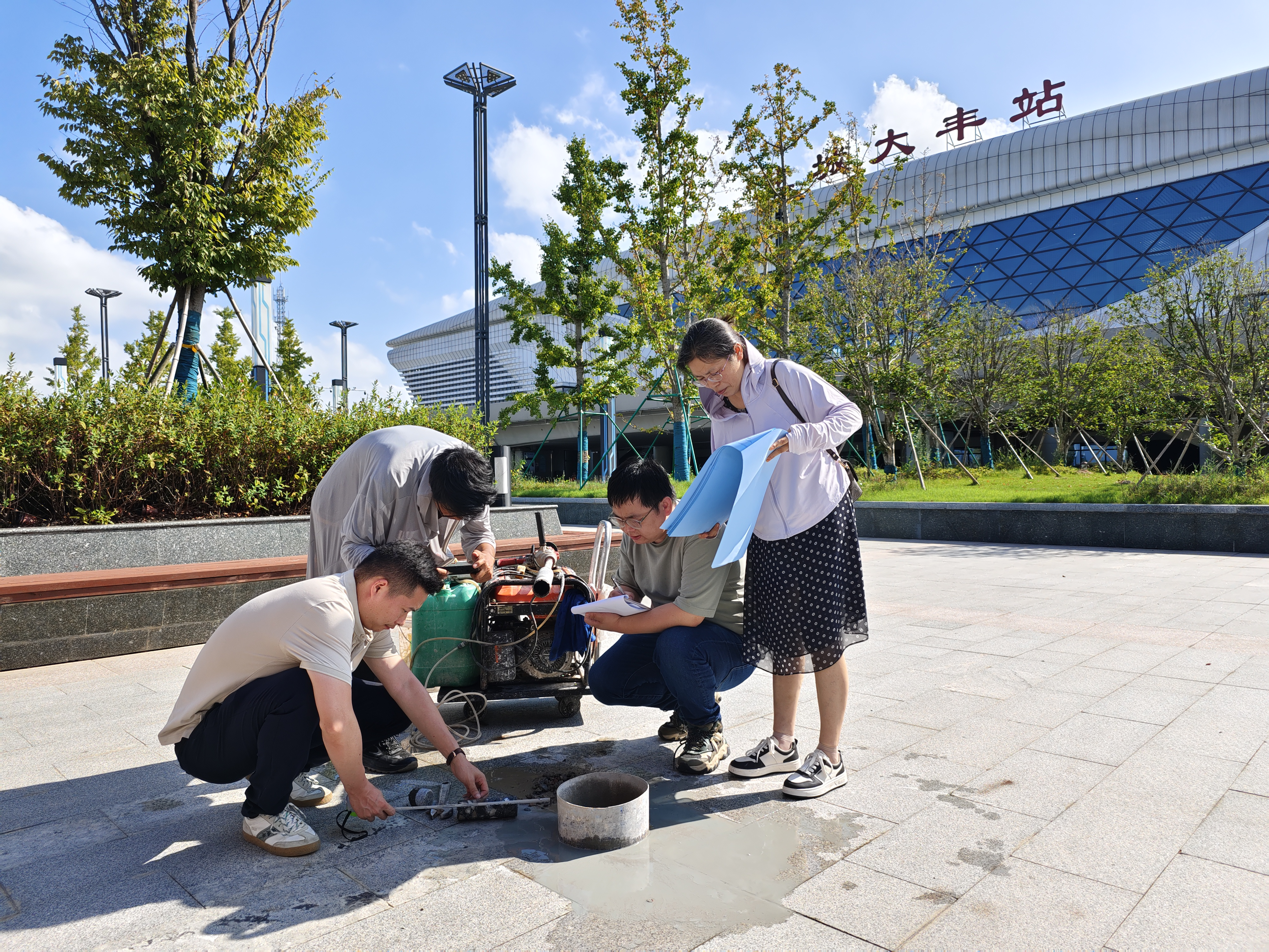 近日,大丰区审计局在该区高铁站站前广场项目审计中,审计人员通过关注建设程序、查阅工程资料、现场检查工程质量等方式,对高铁站站前广场项目建设进行了全方位审计,促进提高项目建设管理水平,保障财政资金的投资效益,充分发挥审计监督作用。图为审计人员在现场勘察广场建设情况。(黄健、徐贵华 )