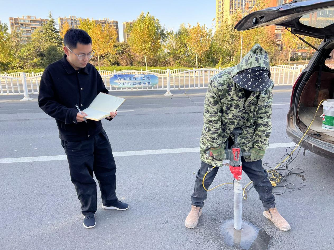 近日,滨海县审计局在县城海港大道改造工程审计中,重点关注道路工程质量情况。审计人员结合施工图纸、招标文件等资料,通过实地勘验、抽样检查等方式,对比工程质量标准,核验施工标准是否符合设计要求,助力保障财政资金落实到位,增强民生福祉。图为审计人员在县城道路施工现场对道路混凝土层进行钻芯取样测量。(何海鹏 吴峰崎)